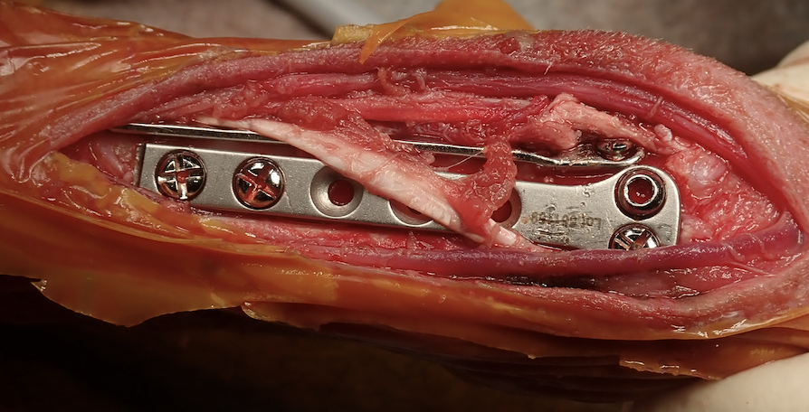 近年、小型犬が増加しているのに比例して橈尺骨骨折が増加しています。橈尺骨骨折にはプレートを2枚入れる方法を用います。2枚入れることで強度を増すことができプレートの破綻を防止できます。また、1枚ずつプレート抜去が可能であるため、ある程度骨が固まってきたら1枚抜去し、さらに骨化を促進し、もう一枚抜去するという方法が可能です。そうすることで癒合不全(骨化が遅れること)を防止し、プレート抜去後の再骨折のリスクを減らすことができます。