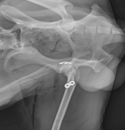 尾腹側脱臼では上記のワッシャーの方法は使用できず、トグルピン法か創外固定法、大腿骨頭切除の方法を用います。トグルピン方は、骨盤臼に穴を開け、そこにトグルピンと呼ばれる特殊な形のピンを挿入し、そこに引っ掛けた人工靭帯を、大腿骨に貫通させた穴に通して固定する方法です。この方法も2週間ほど維持できれば安定化していきます。