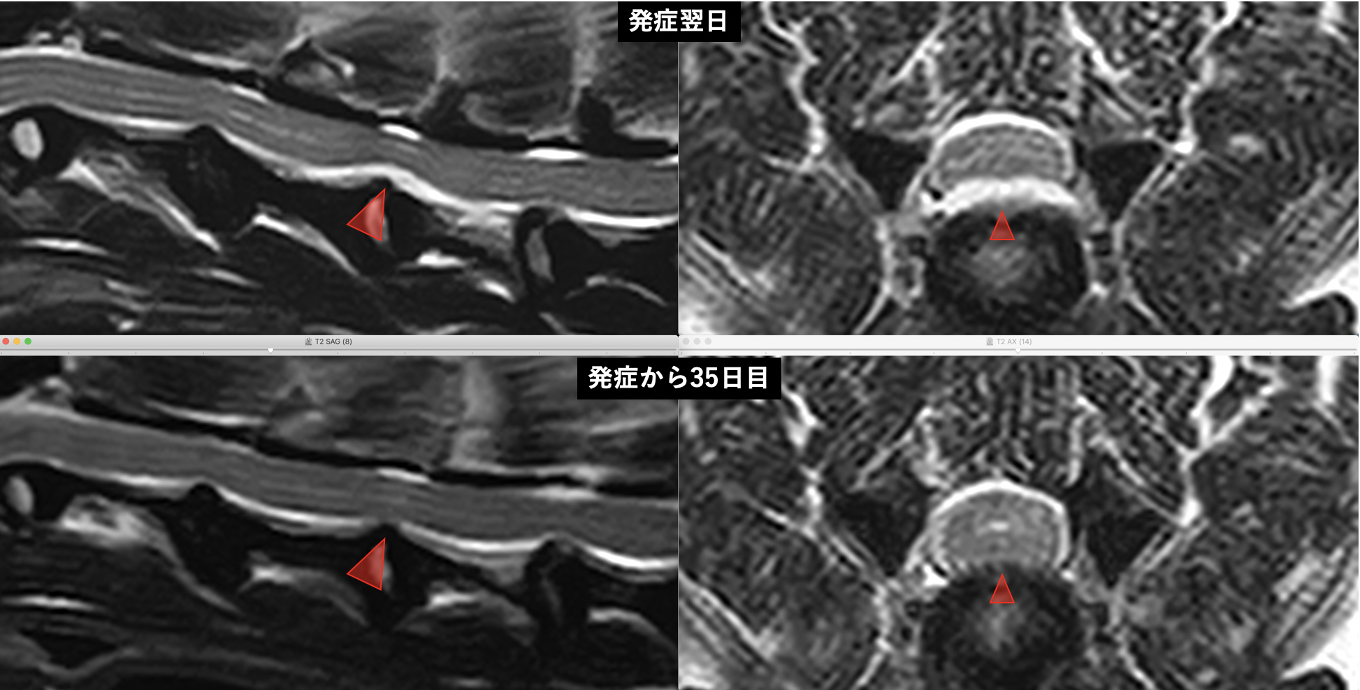 上段が発症時/下段が発症後35日目のMRI:逸脱物質の消失と脊髄圧迫軽減が認められる