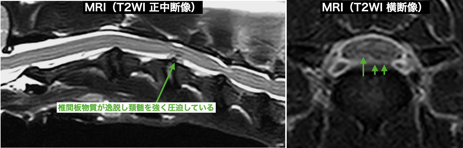 腹側減圧術が適応になる頚部椎間板ヘルニアのMR画像本症例では第3-4頚椎間(緑矢印)における腹側減圧術と第4-5頚椎間におけるPLDDを同時に実施した