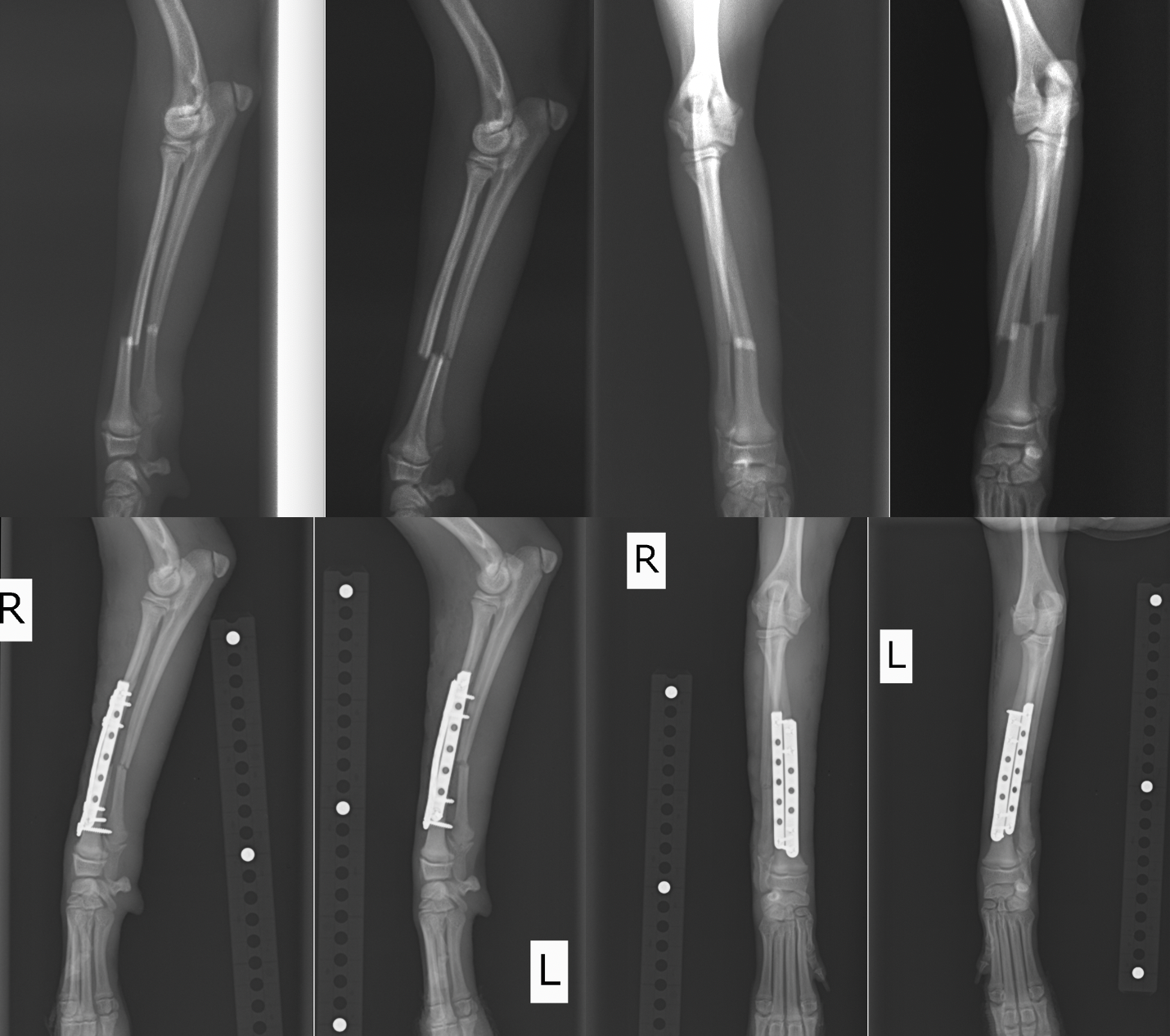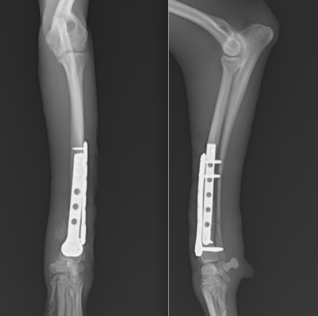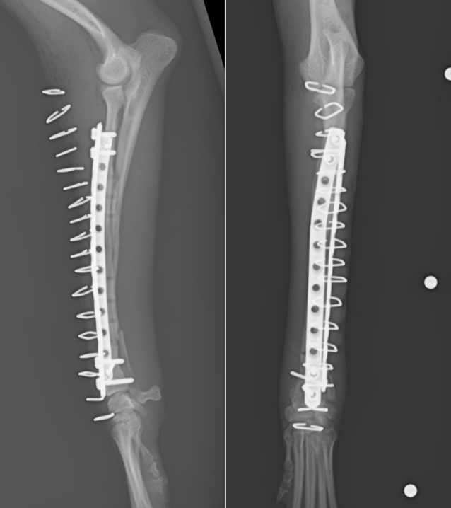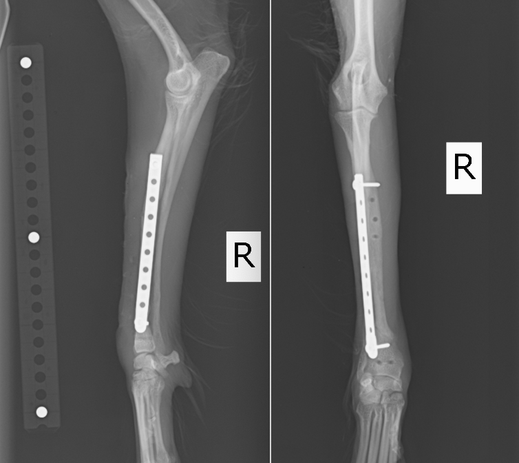 近年、小型犬が増加しているのに比例して橈尺骨骨折が増加しています。橈尺骨骨折にはプレートを2枚入れる方法を用います。2枚入れることで強度を増すことができプレートの破綻を防止できます。また、1枚ずつプレート抜去が可能であるため、ある程度骨が固まってきたら1枚抜去し、さらに骨化を促進し、もう一枚抜去するという方法が可能です。そうすることで癒合不全(骨化が遅れること)を防止し、プレート抜去後の再骨折のリスクを減らすことができます。
