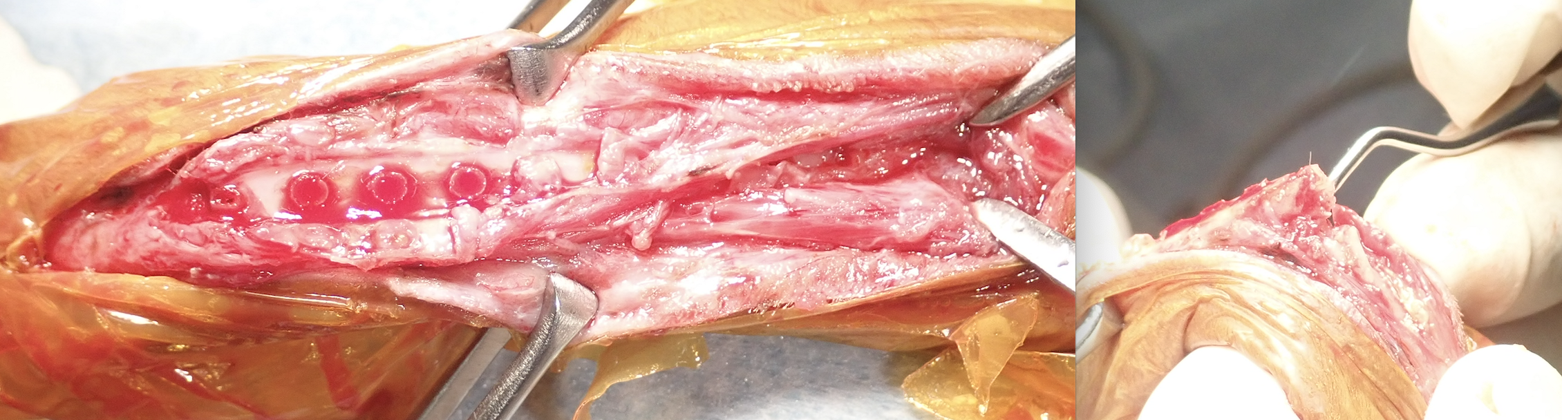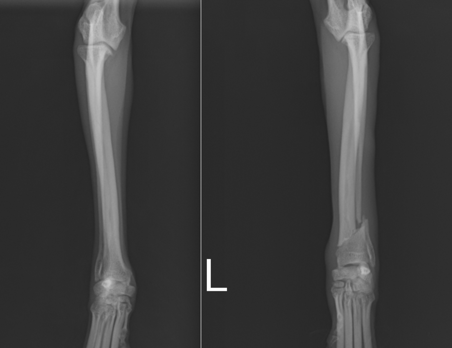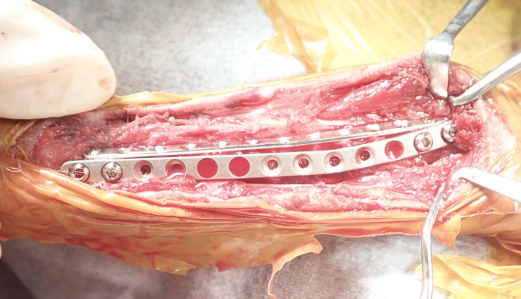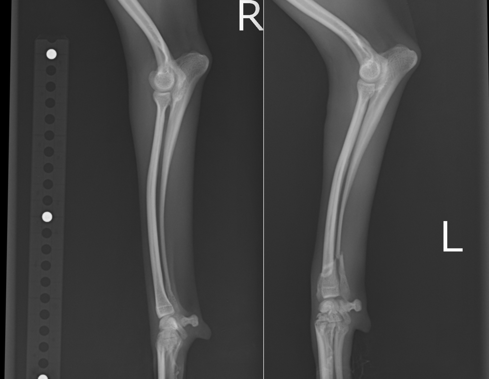 近年、小型犬が増加しているのに比例して橈尺骨骨折が増加しています。橈尺骨骨折にはプレートを2枚入れる方法を用います。2枚入れることで強度を増すことができプレートの破綻を防止できます。また、1枚ずつプレート抜去が可能であるため、ある程度骨が固まってきたら1枚抜去し、さらに骨化を促進し、もう一枚抜去するという方法が可能です。そうすることで癒合不全(骨化が遅れること)を防止し、プレート抜去後の再骨折のリスクを減らすことができます。
