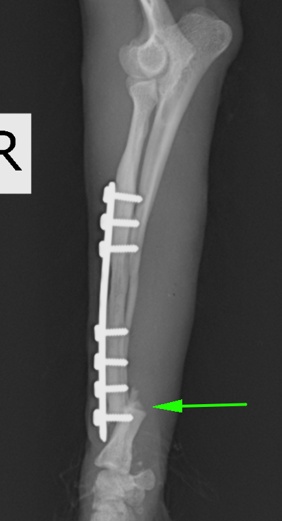 次の症例は以前の骨折を他院にてプレート固定していたそうですが、ある時からまた足を上げるとのことで来院しました。矢印の部分で折れてしまっています。