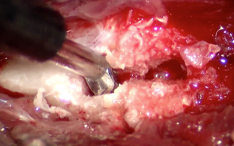 根治治療には逸脱した椎間板物質を摘出する必要があります。胸腰部の椎間板ヘルニアと異なり、頚部では腹側からのアプローチを用います(ベントラルスロット)。まず重要な組織である気管や食道、頸動脈静脈を避け、骨にアプローチします。骨の切削にはラウンドバーとよばれるドリルや、SonoCure(ソノキュア)とよばれる乳化吸引装置を用います。ソノキュアは骨だけを削り、神経や血管などの軟部組織は削れないという利点があります。