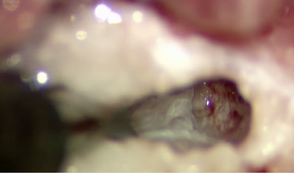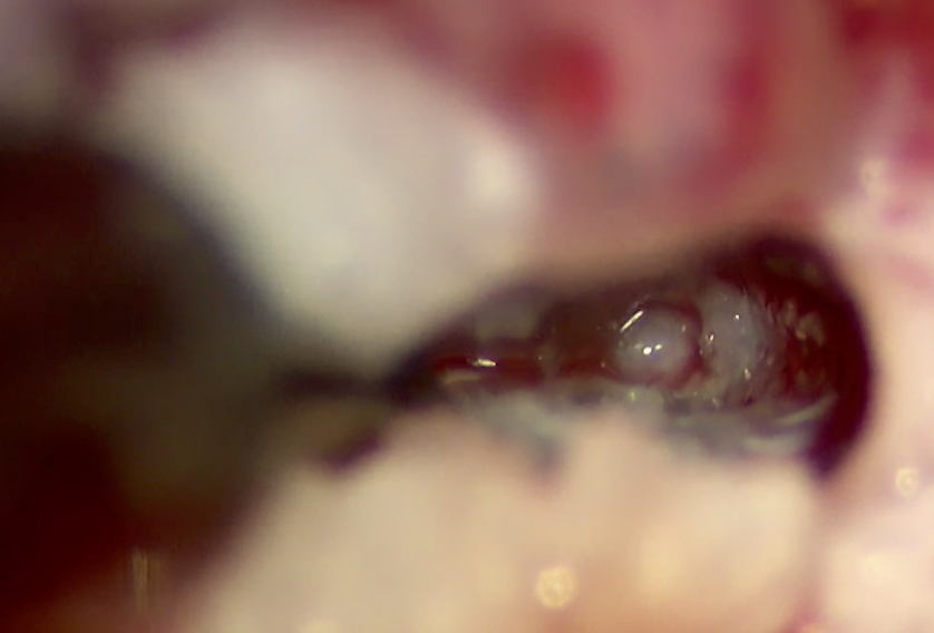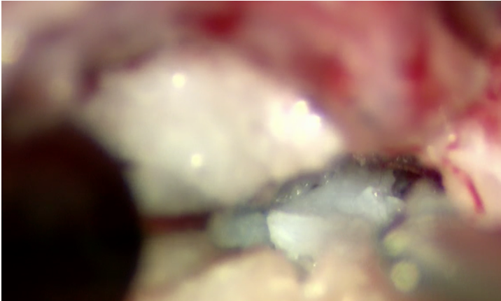 今回の症例では骨の幅が9mmであり、削る幅の最大経が3mmでした。それ以上の幅で削ると不安定性が出て合併症のリスクが高くなります。3mmの幅の内部での操作となるため、肉眼での操作は困難であり、顕微鏡操作が有用となります。以下は顕微鏡下での術野の視野になります。