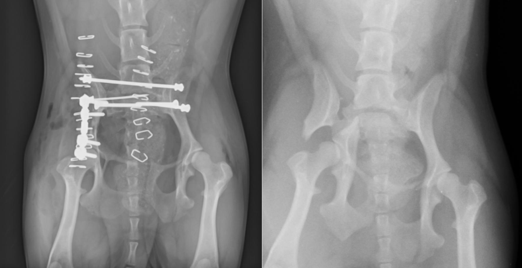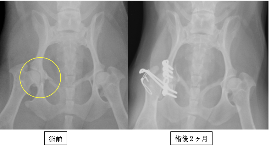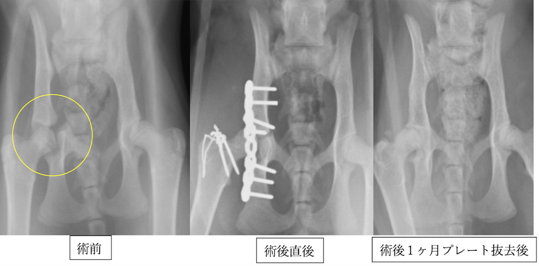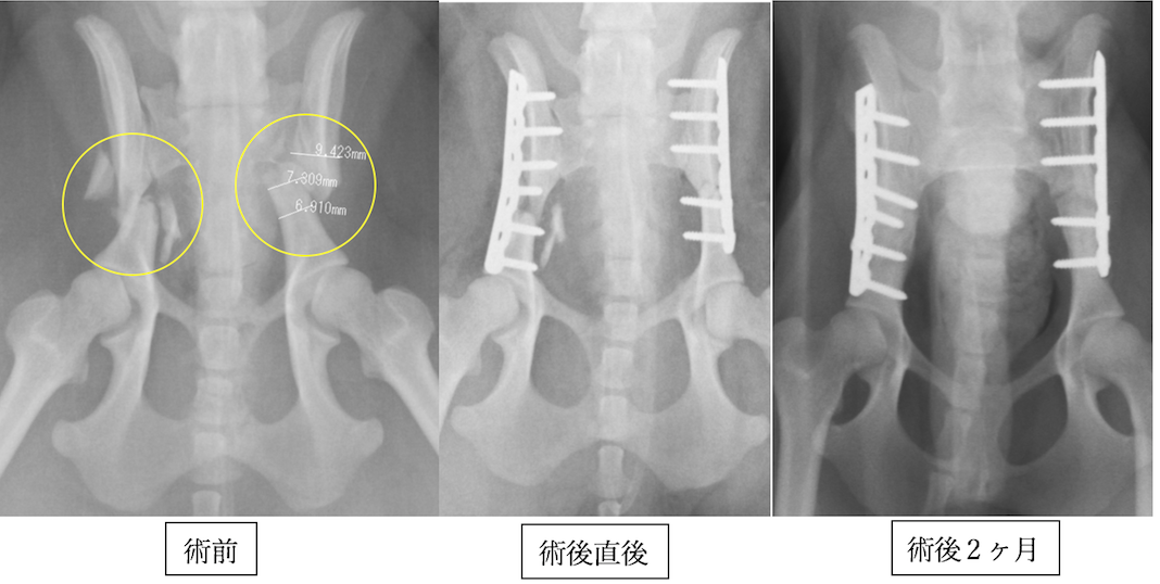 ポメラニアンの骨盤骨折です。両側であり、手術時間の短縮と固定力の強化のためにロッキングプレート・スクリュー(プレートとスクリューが固定されるシステム)を使用しました。プレート抜去はしなくても良いタイプです。
