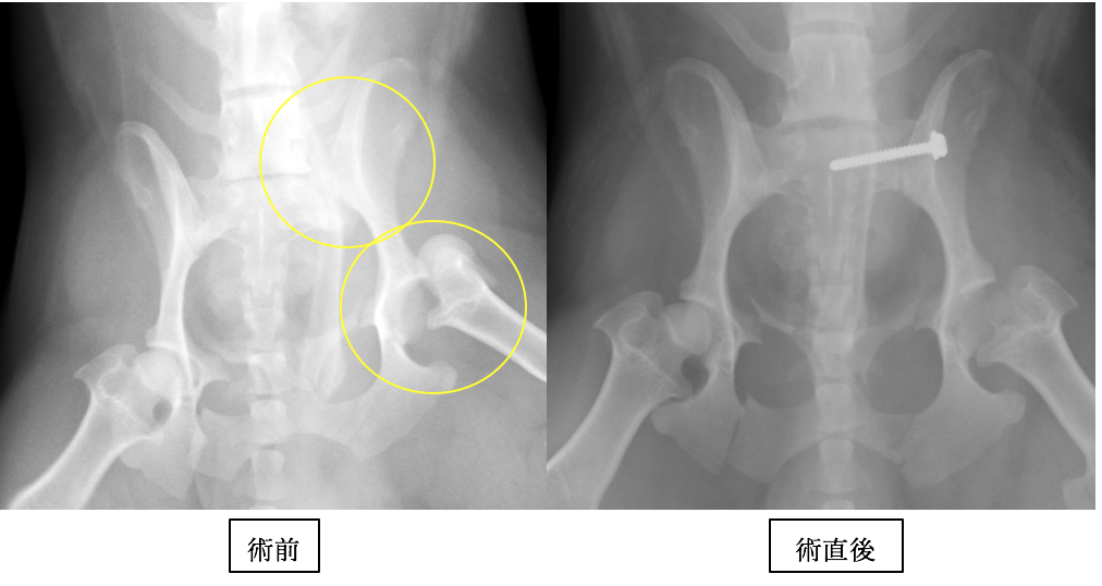 仙腸関節はラグスクリュー法と呼ばれるスクリューによる固定を行い、股関節は大腿骨頭切除術と呼ばれる方法を行っています。