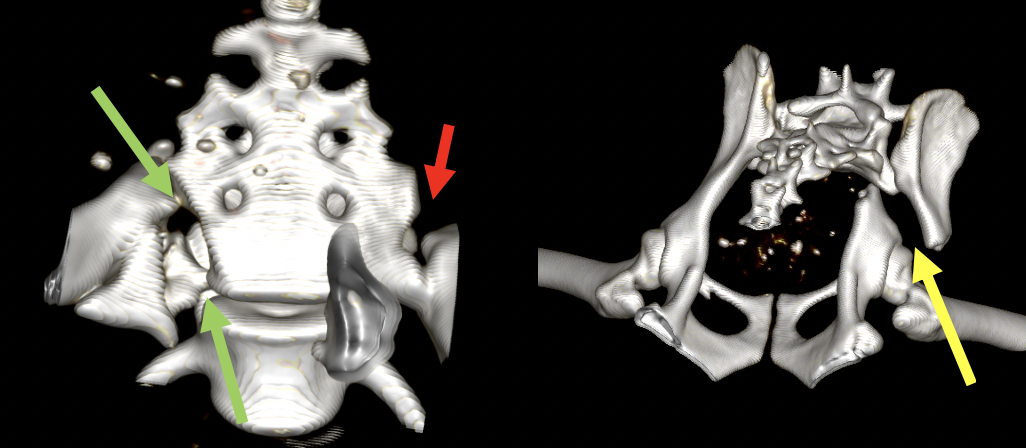 チワワの症例です。左右の仙腸関節が脱臼(正確には左は仙骨骨折)しています。緑は左の仙骨骨折、赤は右の仙腸関節脱臼、黄色は右の腸骨骨折をさしています。