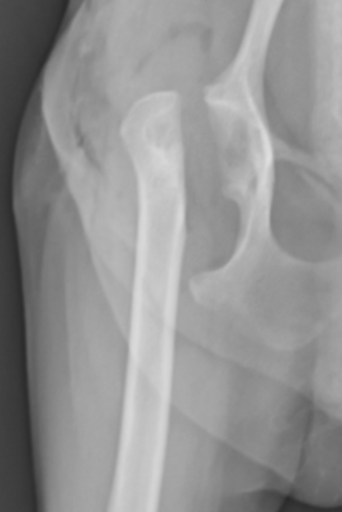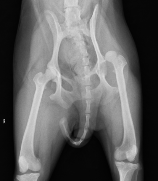 同じ症例ではありませんが、骨頭を切除した症例をご紹介します。症例は8ヶ月のトイプードルで、最近足をあげるということで来院されました。触診では足を伸ばすときに痛がり、レントゲンで骨頭の骨折が認められました。おそらく生まれつきレッグペルテスという病気があり骨頭が折れてしまったのではないかと予想されます。レッグペルテス(=大腿骨頭壊死症)とは主に小型犬種において発生する大腿骨頭の非炎症性無菌性壊死です。犬では生後数ヶ月から1年までに痛みや跛行を主訴に来院されます。原因は大腿骨に栄養が行く血管がうまく発達せず、骨頭の一部が壊死ししてしまうと考えられています。遺伝性と考えられていますが、まだはっきりとしたことはわかっていません。猫でも似たような病態があると最近言われ始めています。