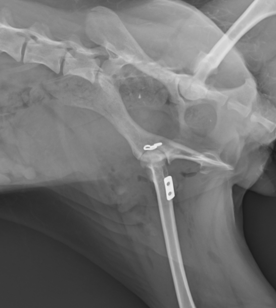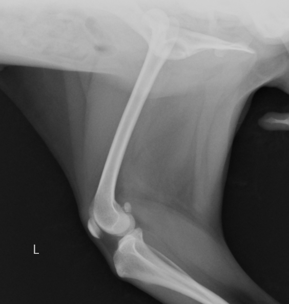 今回はトグルピン法という方法でもとに戻した症例です。症例はトイプードル10ヶ月で、ジャンプしているうちに足を痛がって挙げているとのことで来院されました。レントゲンで前上方脱臼が認められ手術を行いました。