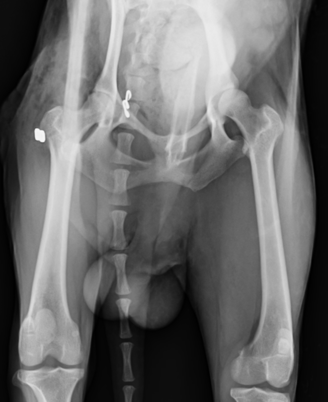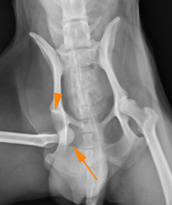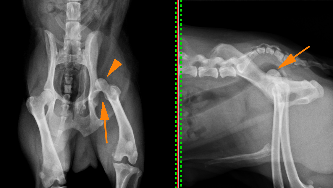股関節が脱臼すると強い疼痛を引き起こし、足を地面に着けることができなくなり挙上してしまいます。股関節脱臼は脱臼する向きによって大きく2つに分けられます。90%が頭背側脱臼というもので、前方かつ、上方に脱臼してしまうタイプです。残りの10%が尾腹側脱臼というもので後方かつ、下方に脱臼してしまうタイプです。治療には用手による整復と、手術による治療がありますが、用手による整復の成功率は非常に低いとされており、基本的に手術によって整復します。頭背側脱臼ではワッシャーによる固定またはトグルピン法、骨頭切除などの術式が選択できます。症例によって治療法を選択しますが、可能であれば骨頭を切除せずに戻すのが理想と言えます。骨頭を切除すると術後の機能回復に時間がかかるのと、機能が元のの70〜80%にとどまると言われているからです。