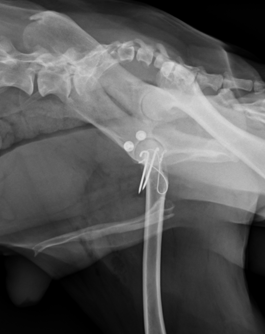 尾腹側脱臼では上記のワッシャーの方法は使用できず、トグルピン法か創外固定法、大腿骨頭切除の方法を用います。トグルピン方は、骨盤臼に穴を開け、そこにトグルピンと呼ばれる特殊な形のピンを挿入し、そこに引っ掛けた人工靭帯を、大腿骨に貫通させた穴に通して固定する方法です。この方法も2週間ほど維持できれば安定化していきます。
