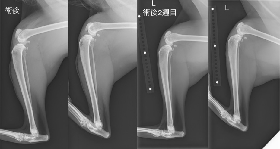 術後と術後2週目の比較(CrTTは認められず、まだ負重は弱いが、患肢も積極的に使うようになってきました。)