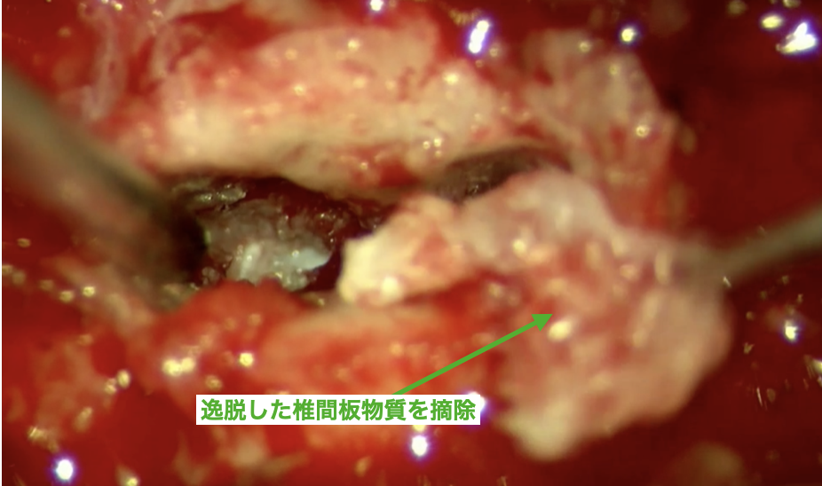 作成したスロットから逸脱した椎間板を摘出している様子(術者が見ている手術用顕微鏡の画像)