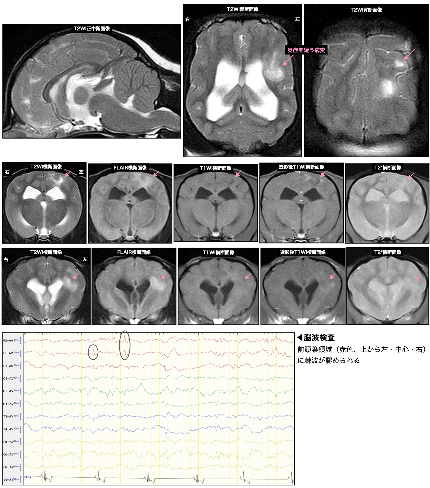 MRIと脳脊髄液検査では、大脳に壊死性白質脳炎を疑う所見が認められました。また、病変部位に一致する脳領域にてんかん性異常脳波(スパイクや鋭波と呼ばれる)が認められました。