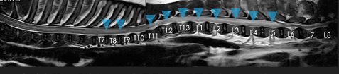脊髄が進行性脊髄軟化症を強く疑わられるMRI(青矢頭領域)